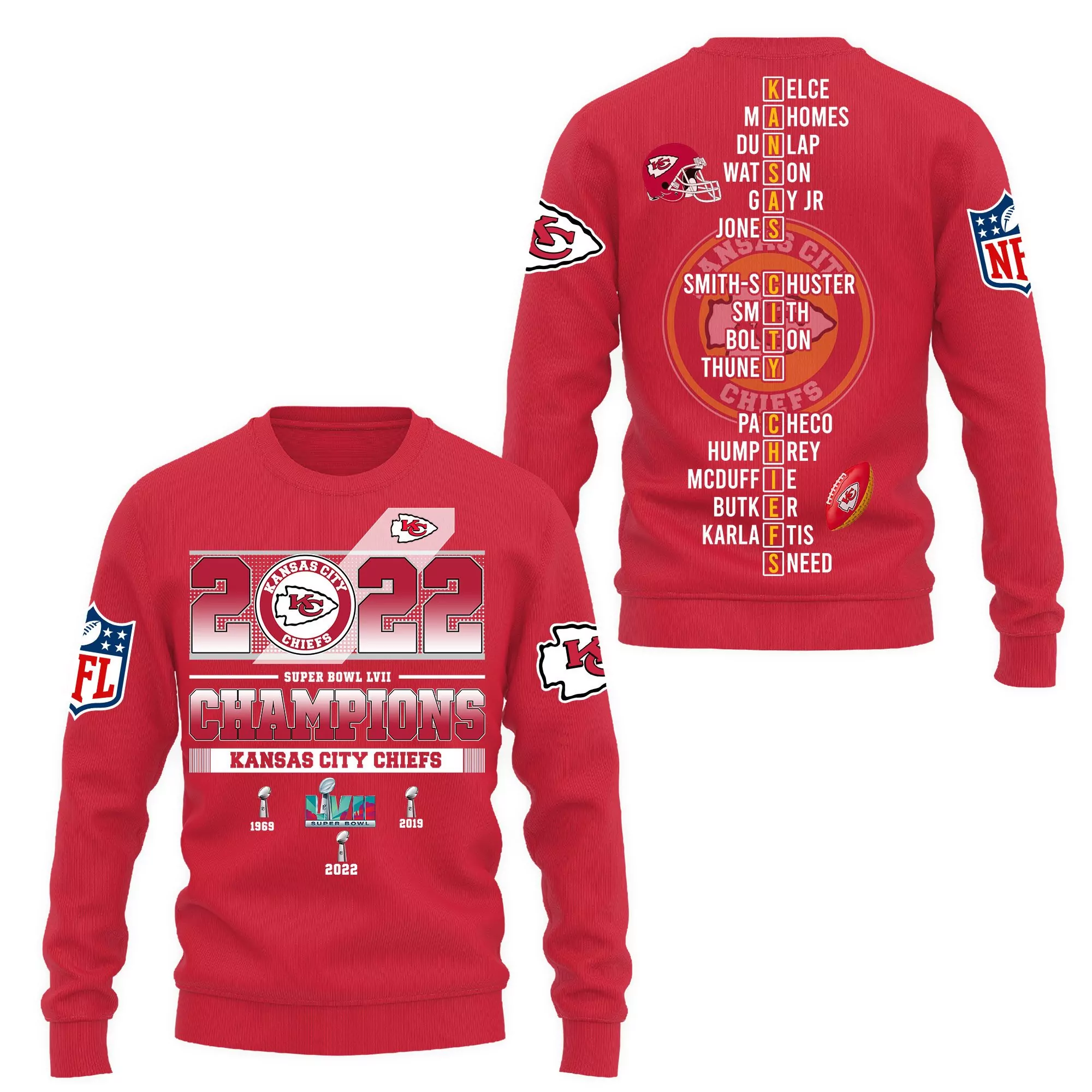 Design01: NFL Kansas City Chiefs Xmas Snp Limited Edition 28810 3d sweatshirt;Design02: NFL Kansas City Chiefs Xmas Snowman Limited Edition 31510 3d sweatshirt;Design03: NFL Kansas City Chiefs Super Bowl LVII Champions Sweatshirt 3d sweatshirt;Design04: NFL Kansas City Chiefs Xmas Mickey Limited Edition 31210 3d sweatshirt;Design05: NFL Jerick McKinnon Kansas City Chiefs American Football Conference Champions Sweatshirt 3d sweatshirt